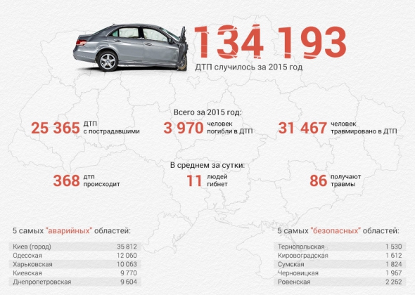 Щодня на дорогах України гине 11 осіб. Всього за минулий рік в ДТП загинуло 3970 осіб – це менше, ніж у минулому році (4483 людини). У 2015 рокці в ДТП травмувалося 31467 осіб, що в середньому за добу дає показник 86.