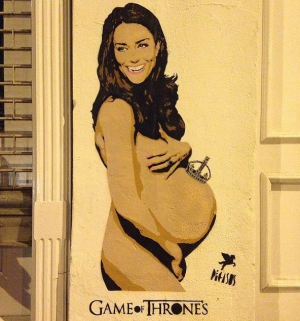 Нагадаємо, в листопаді відомий американський художник на ім'я Пегас намалював портрет оголеної герцогині Кембриджської на стіні будівлі художньої галереї Faith Inc. Пегас зобразив оголену Кейт Міддлтон на останньому триместрі вагітності і з короною на животі. Свою роботу художник підписав як "Гра престолів".