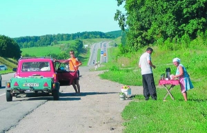 — З доброго життя ми б сюди не йшли, — каже жінка років 45. — У такому возрасті я на заробітки вже не поїду. Приходиться торгувати тут. Роблю як для своєї сім'ї. Водітєлі нас знають давно, купляють без опаски. А міліція гонить постоянно. Буває таке, що приїжджає машина й гребуть усіх, кого бачать. По кущах із наручніками бігають, шукають, хто з продавців поховався.