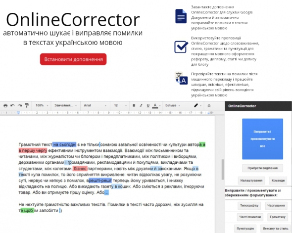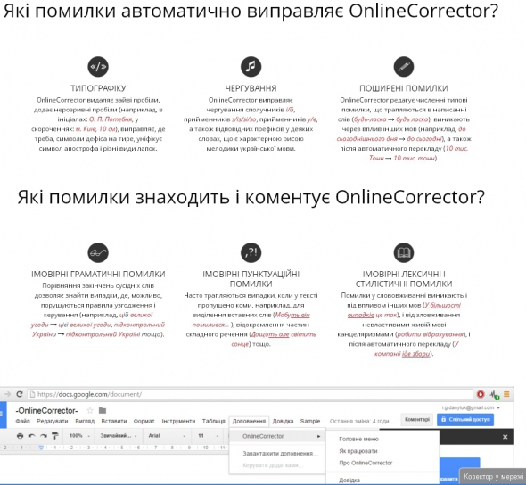 "OnlineCorrector піднімає на новий рівень лінгвістичну підтримку в роботі з текстом українською мовою. Звичну перевірку орфографії від Google ми доповнили виправленням і пошуком помилок у слововживанні та стилістичних огріхів, що виникають під впливом інших мов чи після автоматичного перекладу", - пояснюють ініціатори розробки.