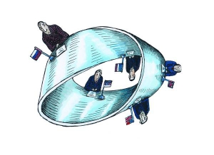 Між Євросоюзом, Росією і паразитичною владою пострадянської України весь час триває боротьба за ресурси, що загострюється в міру поглиблення світової кризи. Після Майдану-2014 боротьба за "український пиріг" перетворилася на відкрите і небезпечне протистояння. Шлях до замирення всі три сторони конфлікту вбачають у тому, щоб чіткіше розділити сфери впливу розчленуванням України приблизно по Дніпру. Згідно з цим задумом, одна частина української владної верхівки зберігає своє панування й переходить під протекторат ЄС — зі спільною утилізацією наявної в країні власності. Друга частина верхівки переходить під протекторат Росії з такими ж наслідками, тільки у брутальнішій формі. Ми є свідками агресивних торгів щодо того, кому скільки дістанеться.