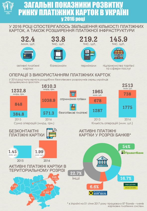 "Частка безготівкових платежів з використанням платіжних карток за 2016 рік збільшилась за обсягом операцій на 4.3% і становила 571,3 млрд грн. Це 35,5 % від загального обсягу операцій за платіжними картками", - сказано в повідомленні.