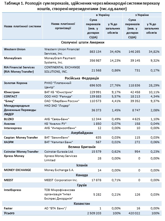 Найчастіше українці отримують грошові перекази з таких країн: Росія - 45%, США -12%, Італія -5%, Ізраїль -4%, Іспанія -2%, Інші - 32%.