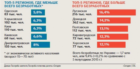 Найбільш благополучною є Одеська область, де без роботи 5,8% працездатних осіб, або 83 тис. чоловік при населенні регіону 2,39 млн чоловік. На контрольованих територіях Донецької та Луганської областей без роботи понад 600 тис. осіб — майже кожен, або третина від безробітних по всій країні, передає видання Сегодня.