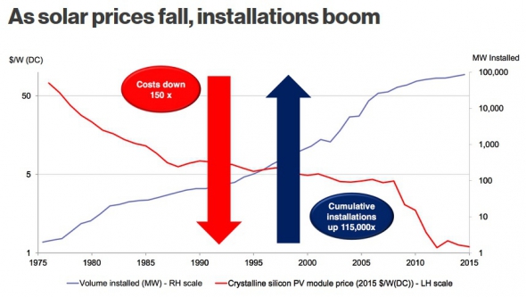 Згідно з результатами дослідження Bloomberg New Energy Finance за друге півріччя 2015 року відбулися значні зміни у цінах на поновлювальні джерела енергії і викопні види палива. Морський вітер і сонячні батареї - найпоширеніші джерела зеленої енергії. Обидва впали в ціні минулого року, в той час як витрати на газові та вугільні електростанції ростуть. Так, вартість електроенергії для берегового вітру впала з $85 за МВт в перше півріччя 2015 року до $83 у другій половині, в той час як вартість для кремнієвих панелей впала з $129 до $122. Паралельно ціна електроенергії для вугільної генерації збільшилася з $80 за МВт до $91 в середньому в світі. А ще агентство повідомляє (і це показова інформація): "Ціна батарей для зберігання сонячної енергії, впродовж періоду, коли сонце не світить, стрімко зменшується".