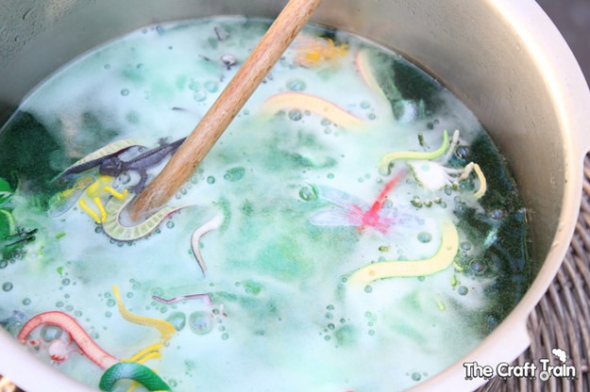 Щоб приготувати зловісне відьмине вариво, додайте в "котел" з водою пару-трійку столових ложок соди, харчовий барвник і різних пластикових іграшкових гадів - змій, жуків і павуків. Розмішайте і сміливо додавайте найдешевший оцет - вариво відразу почне вирувати, що призведе дитини в захват. Соду і оцет можна додавати, поки не набридне.