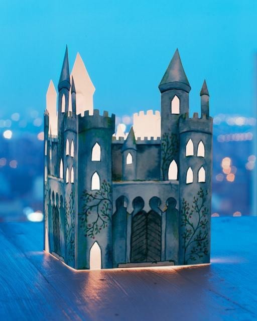 Намалюйте на щільному папері замок в чотирьох примірниках (можна обвести цей). За допомогою ножа для паперу акуратно виріжте вікна, а потім і всі чотири силуету. Перш ніж склеїти їх між собою, "позанавішуйте" вікна зі зворотнього боку маленькими шматочками туалетного паперу. Поставте нічник поверх джерела світла і насолоджуйтеся.