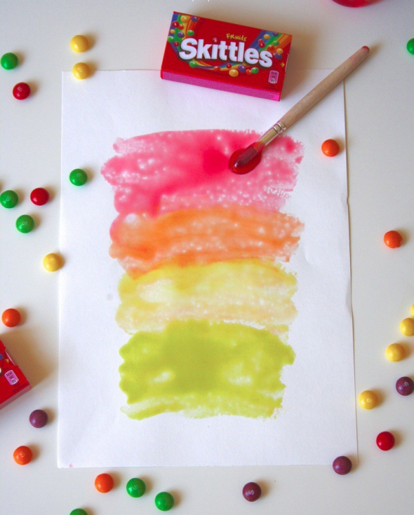 Здійснюємо набіг на найближчий магазин, скуповуємо там кілька пачок цукерок Skittles, які вдома сортуємо за кольорами, а потім розчиняємо в цукровій воді. Картини, намальовані такою солодкою фарбою, виходять яскравими і блискучими, а головне - їх при великому бажанні можна (але не потрібно облизати.