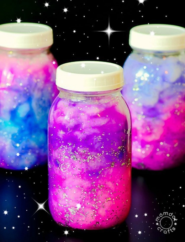 Для цього вам знадобиться скляна банка з кришкою, вата, блискітки, фарба трьох кольорів і вода.