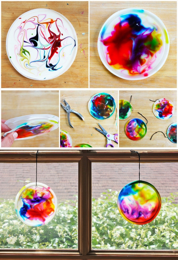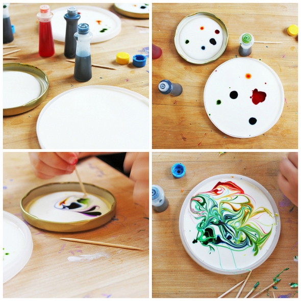 Для цього вам знадобиться клей ПВА, пластикові кришечки, харчові барвники або акварельні фарби і зубочистки. В кришку виливається клей, так, щоб цілком покрити поверхню. Потім додається пара крапель фарби або харчового барвника різних кольорів, все це акуратно розмішується за допомогою зубочистки. Особливо не захоплюйтеся з розмішуванням, інакше кольори вийдуть брудними.