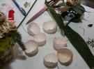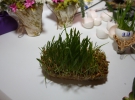 Перепелині шкаралупи приклеює на сіно прикріплене до згорнутого в кільце листка. Додає кілька сухих квіток й готове кільце для серветки до великоднього столу. Половинка курячого яйця встановлена у ячейку на святковому столі добре служить за вазу для дрібних квітів, гілочок розквітлої вишні.