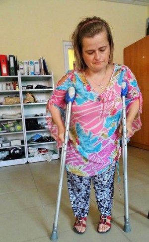 "Минулого року я знову зламала ногу в двох місцях. Мені поставили імпланти-шурупи в тазо-стегновий суглоб, щоб можна було ходити. Але кістки дуже крихкі, ці імпланти довго не зможуть триматися. Вони або самі вийдуть з кістки, або почнуть заважати мені ходити. Після постійних переломів і операцій, мої кістки як трухляве дерево, ноги в колінах не згинаються.Тому вже нічого не можна зробити, крім як замінити тазо-стегновий, колінні суглоби.
