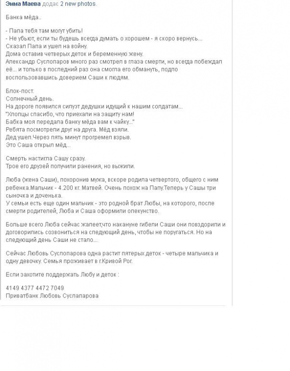 "Смерть наздогнала Сашу відразу. Люба (дружина Саші), поховавши чоловіка, незабаром народила четвертого, спільну з ним дитину. Хлопчик - 4.200 кг. Матвій. Дуже схожий на тата. Тепер у Сашка три синочка і донечка. У родини є ще один хлопчик - це рідний брат Люби, на якого, після смерті батьків, Люба і Саша оформили опікунство. Найбільше Люба зараз шкодує, що напередодні загибелі Сашка вони посварилися і домовилися зідзвонитися на наступний день, щоб не посваритися. Але наступного дня Сашка не стало. Зараз Любов Суслопарова одна ростить п'ятьох діток - чотири хлопчики і одну дівчинку", - пише на своїй сторінці у Фейсбук волонтер Емма Маєва.