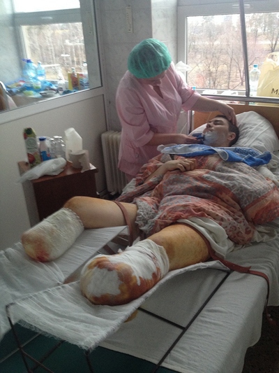 "Не можу поки навіть прогнозувати, коли ми зможемо перевести Вадима у відділення, - каже завідувачка гнійно-септичної реанімацією столичного Центру термічних травм та пластичної хірургії київської клінічної лікарні № 2 Наталя Ісаєнко. - У Вадима постраждали не тільки стопи, але і гомілки, є відмерлі ділянки шкіри. Але ми б'ємося за кожен сантиметр постраждалих тканин. Вадима чекає довге лікування і відновлення. На жаль, некроз глибоко вразив ступні. Лікування, яке ми проводили, не дало ефекту. Мені самій боляче говорити про те, що цьому молодому бійцю, що залишився без руки, ми ампутували ще й обидві ступні. Вадиму найближчим часом будемо вводити препарати крові. Тому ми просимо всіх небайдужих людей, готових стати донорами, приходити в нашу клініку, яка знаходиться за адресою: Київ, вулиця Краківська, 13".