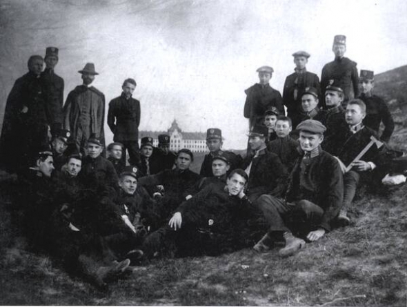 Популяризатор футболу в Галичині викладач німецької мови Іван Боберський (у капелюсі) із львівськими гімназистами-українцями на прогулянці, 1912 рік