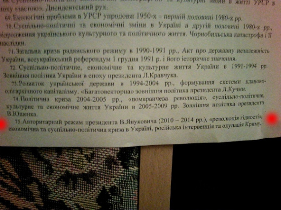 Питання №75 у відповідних білетах звучить як "Авторитарний режим президента В. Януковича (2010-2014 рр.), "революція гідності", економічна та суспільно-політична криза в Україні, російська інтервенція та окупація Криму".