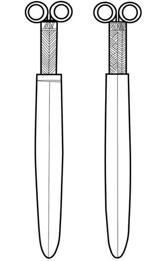 Подібні малюнки можна побачити на стародавніх бронзових дзвонах, знайдених в Японії. Відлиті в такій формі кинджали мали б прямий клинок і не володіли гардой.