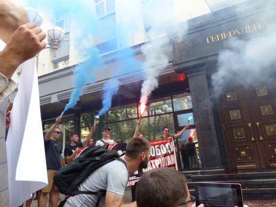 29 липня під стінами Генпрокуратури України відбулась акція на підтримку підозрюваних у вбивстві журналіста Олеся Бузини Андрія Медведька і Дениса Поліщука. Активісти палили фаєри та облили двері свинячою кров'ю.