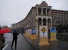 З самого ранку біля стели встановили дві сцени для виступів. Але підхід до них перекрили на рівні сходів. Навпроти, де за часів майдану була сцена, поставили стенди з плакатами часів Євромайдану. Серед них карикатури на тодішнього президента Віктора Януковича, заклики та гасла тих часів.