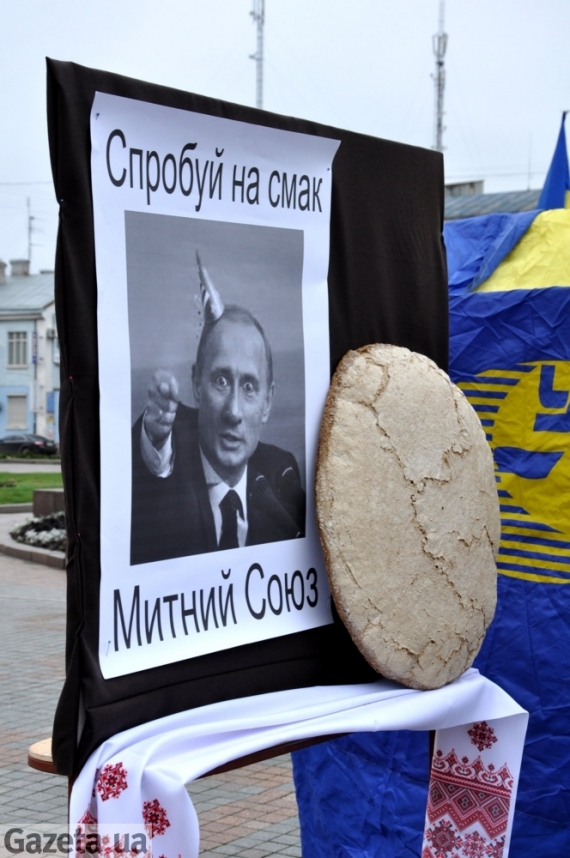 У суботу о 14-тій годині на Майдані Незалежності у Рівному проходить акція пам'яті жертв Голодомору. Двоє активістів кладуть на вишитий рушник велику сіру хлібину. За хлібом на стенді висить великий плакат зі зображенням Володимира Путіна, який показує дулю. Підпис під фото – "Спробуй на смак Митний союз!".