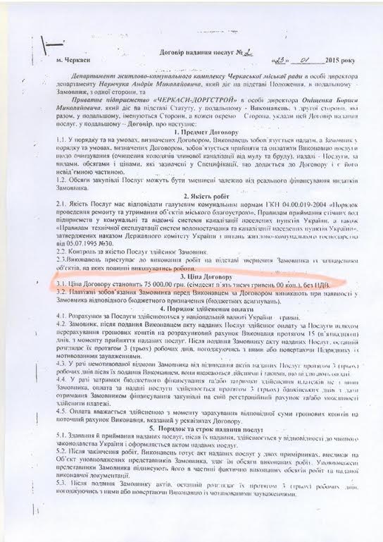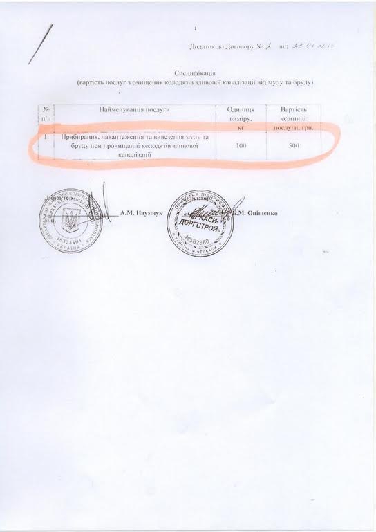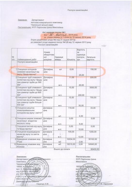 Захмарні суми за очистку колодязів сплачуються містом підприємству "Черкаси-Дорстрой", яке було обране замовником без тендерних процедур. У договорі з підприємством зазначено, що за очистку ста кілограмів бруду місто платить 500 гривень. Оскільки лише з одного колодязя виймають до півтонни бруду, обслуговування одного колодязя сьогодні коштує бюджету понад дві тисячі гривень. У той час, як переможець минулорічного тендеру ПП Ларіонова очищало колодязі від мулу та бруду по 25 грн. за одиницю.