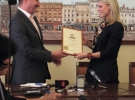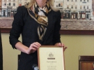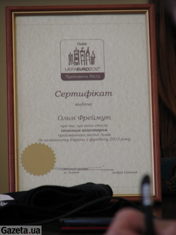 Також Директор департаменту Євро 2012 Олег Засадний вручив Ользі сертифікат волонтера від імені мера міста Андрія Садового та подарував футболку.