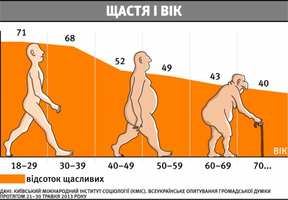 Чим старша людина, тим менш щасливою вона є. Такими є результати опитування Київського міського інституту соціології. Так, у віці 18-29 років кількість щасливих українців становить 71%, а у віціі 70 і більше - 40% і менше.
