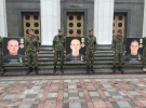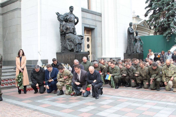 На коліно перед фото загиблими стали міністр внутрішніх справ Арсен Аваков та його радники. На мітингу також зачитали резолюцію.