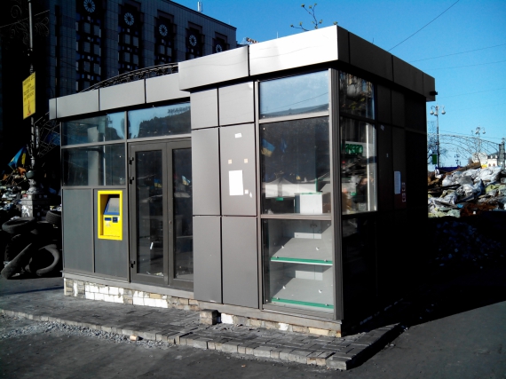 Біля барикади зі сторони Європейської площі на Майдані Незалежності невідомі встановили новенький торговельний кіоск. Знаходиться біля будинку по вулиці Хрещатик 7/11, де ще місяць тому тривали бої між мітингувальниками та правоохоронцями.