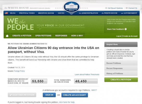 Америка запропонувала українським громадянам підписати петицію про безвізовий режим до 90 днів перебування у країні.