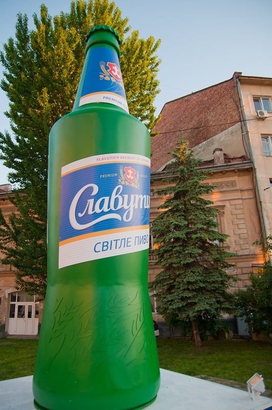 Вночі 26 травня 2011 року, одночасно в Києві (Майдан Незалежності), Донецьку (Площа Комунарів) та Львові (Митна площа), спеціальна команда відкрила 6-метрову конструкцію пляшки "Славутич". У тому разі, коли будете відпочивати, пройдіться центром міста. На площі можна долучитися до пивоб'єкту в масштабі 25:1, а в найближчому магазині – в масштабі 1:1.