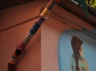 А у дворі Театру юного глядача відкрили проект ярн-бомбінгу Божени Городницької. Львівська майстриня зв'язала пальму - прикрасила стічну дощову трубу в'язаними нитками.