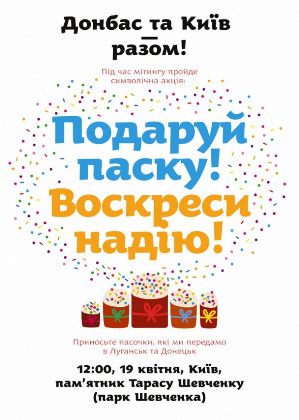 Під час мітингу "Донбас та Київ - разом", що пройде у суботу в парку Шевченка, відбудеться акція "Подаруй паску – воскреси надію!"
