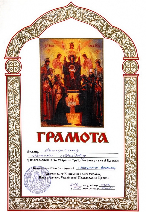 Відскановану грамоту "за труди на славу святої Церкви" опублікував на своєму офіційному сайті сам Кашпіровський.