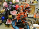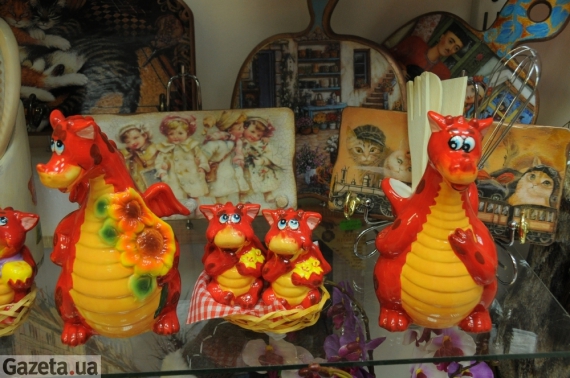 До нового року у магазині подарунків великий попит на сувенірних драконів. Покупцям пропонують від найдешевших керамічних червоних динозавриків для кухні у формі сільничок — за 90 гривень до драконів ручної роботи з деревної смоли. Олександр Бельський бере до рук червоно-синього дракона з довгими вусами: