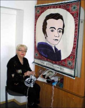 — В"язати картини значно важче, ніж вишивати — готових і розписаних під хрестик малюнків нема, — зауважує Надія. — Спочатку розраховую на петлі. Один хрестик — одна петля. Нещодавно почала портрет Івана Франка шириною 235 петель. Потім розписую кольори, підбираю нитки. Беру штучні — аби міль не точила. Для краси та міцності додаю різнокольоровий люрекс. Портрети в"яжу зазвичай спицями три з половиною, використовую лицевий візерунок. "Двійкою" плету невеликі ікони. Щоб не спотворювати обличчя святих на однотонному полотні, контури вишиваю нитками. Ось, гляньте, — показує в"язаний образ "Плащаниця". — Контури Ісуса вишиті чорними нитками. Чотири місяці в"язала.