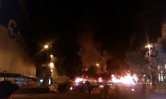 "Полум'я дуже велике. Люди на Майдані розбігаються, побоюючись вибуху. Деякі намагаються відтягнути шини, щоб завадити поширенню полум'я", - зазначив очевидець.