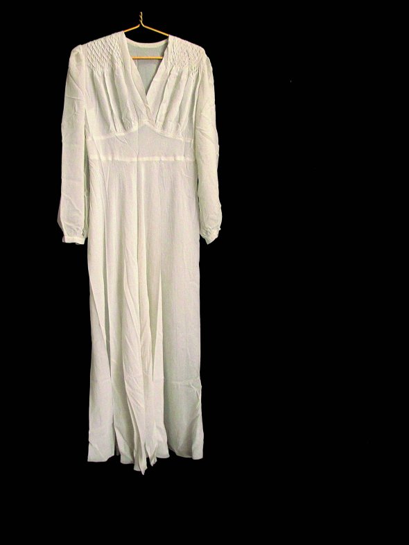 Сукня з білого шовку. Довга – до щиколоток, на стегнах вужча, а внизу пишніша. З широким рукавом і невеликим вирізом на грудях.
