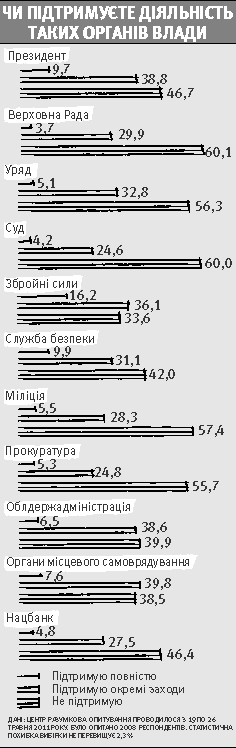 Найменшу підтримку мають правоохоронні та судові органи. За нашими дослідженнями, їх вважають найбільш корумпованими. Не кожен особисто стикається з корупцією в суді та міліції, але історії на зразок судді-колядника Зварича сформували таку точку зору.