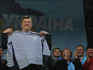 На минулих вихідних 57-річний прем"єр Віктор Янукович з"їздив до Севастополя. Там йому подарували полосату "тєльняшку", яку зазвичай носять моряки. Глава уряду одягати смугасту майку не став, лише приклав поверх піджака.