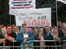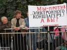 Вони тримають плакати: "Ні електронного реєстру для православних", "Ми проти електронних паспортів", "Ми проти електронного концтабору", "Ми не хочемо електронного рабства", "ID-картки - мітка диявола, електронний паспорт - пропуск в пекло".