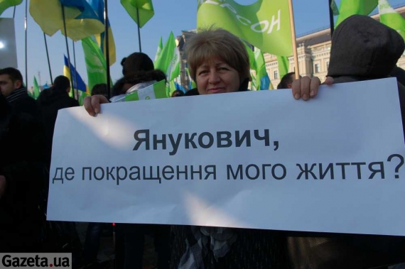 Вони вийшли на акцію протесту проти дій президента Віктора Януковича, яку організувала партія "Фронт змін". Мітингувальники тримали прапори "Фронту змін" та національні стяги. Дехто прийшов із символікою партії "Батьківщина".