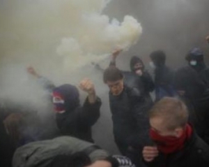 Молоді хлопці в масках розхитують другий автобус та хочуть його перекинути. За автобуси із міліцією хтось кинув дві димові шашки.