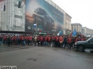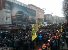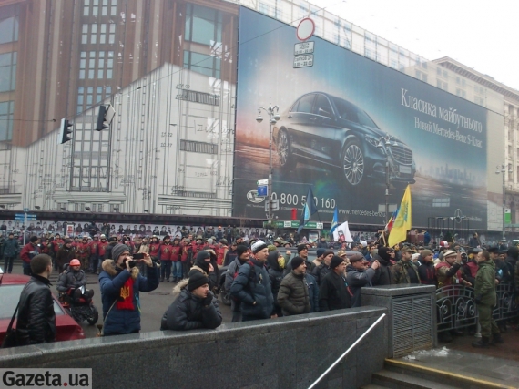 До барикади, що біля столичного ЦУМу, прийшли до сотні молодих хлопців для того, щоб знести укріплення мітингувальників. У них на руках є жовто-червоно-голубі пов'язки. Тут їх зустріли сотні людей з самооборони Євромайдану.