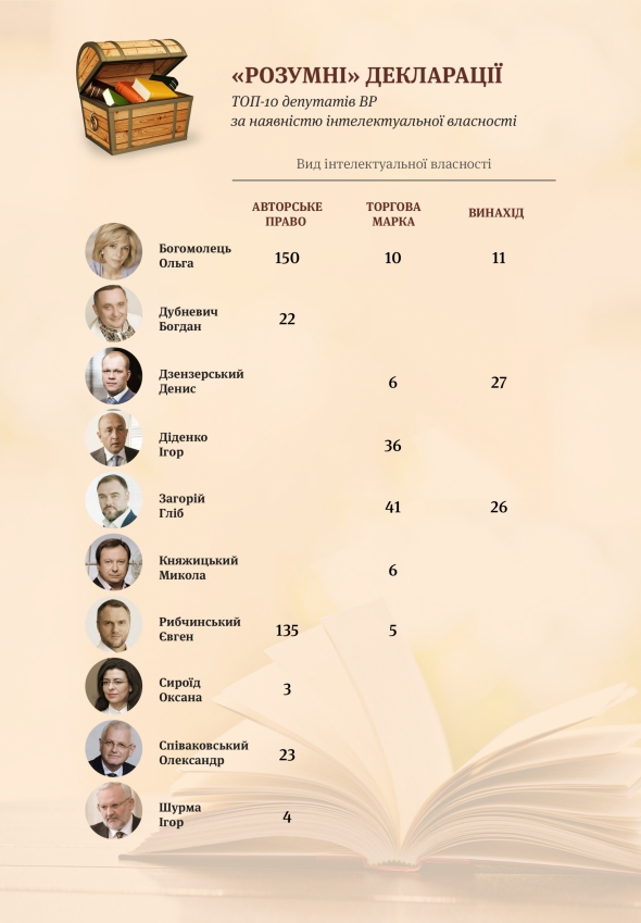 Більше всього об'єктів авторського права у члена БПП, голови комітету з питань охорони здоров'я, за сумісництвом, відомого барда Ольги Богомолець. Вона задекларувала 150 об'єктів авторського права, а також 11 винаходів і 10 торговельних марок. Трохи відстав від неї музикант Євген Рибчинський з депутатської групи "Воля народу", який задекларував 135 об'єктів авторського права та 5 торгових марок.