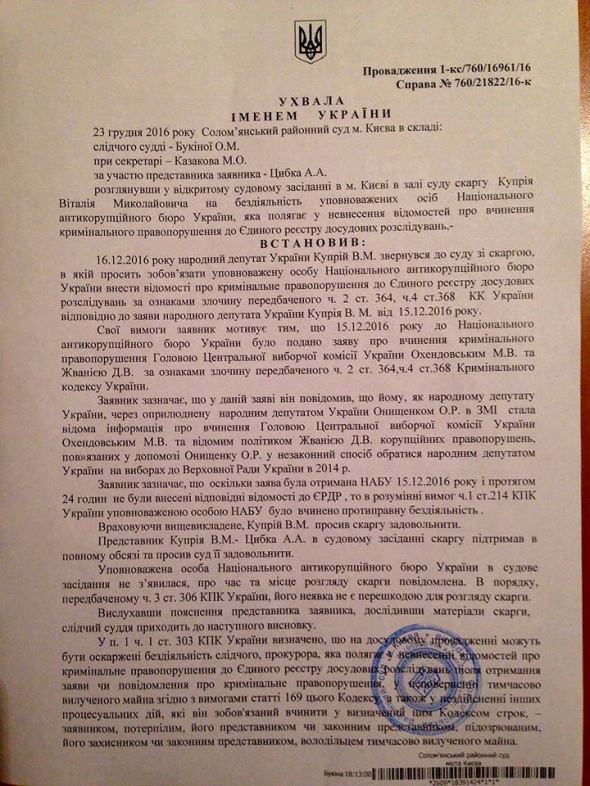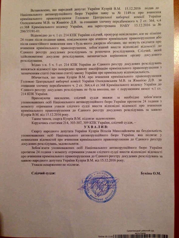 Декілька днів тому я звернувся до директора НАБУ Артема Ситника із заявою про злочин голови ЦВК Михайла Охендовського, який 2014 року протиправно, із порушенням рішення суду, зареєстрував Олександра Онищенка кандидатом у народні депутати. Тобто Охендовський вчинив злочин, передбачений ч. 2 ст. 364 КК України (зловживання владою) і має бути притягнутий до кримінальної відповідальності.
