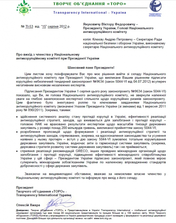 Керівник представництва в Україні Transparency International Олексій Хмара надіслав на адресу президента Віктора Януковича листа про свій вихід зі складу Національного антикорупційного комітету при президентові України.
