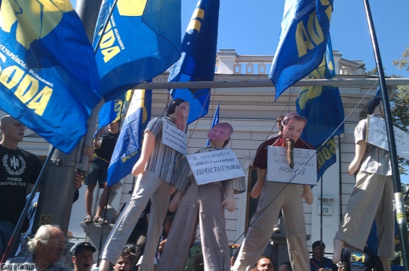 "З Верховної Ради надійшла перша інформація - спікера Литвина не зняли з посади. Це ганьба. Очевидно, він прийшов задоволений бандою. Після 28 жовтня нарешті в Україні буде українська влада. Саме тому ми тут. Смерть ворогам, геть московських холуїв, зека геть!" - виголосив один з представників "Свободи".