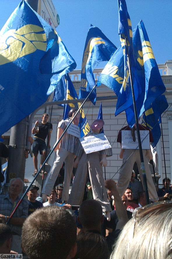 Як передає кореспондент Gazeta.ua, люди тримають прапори ВО "Свобода", Об'єднаної опозиції, КУН та Народного Руху.