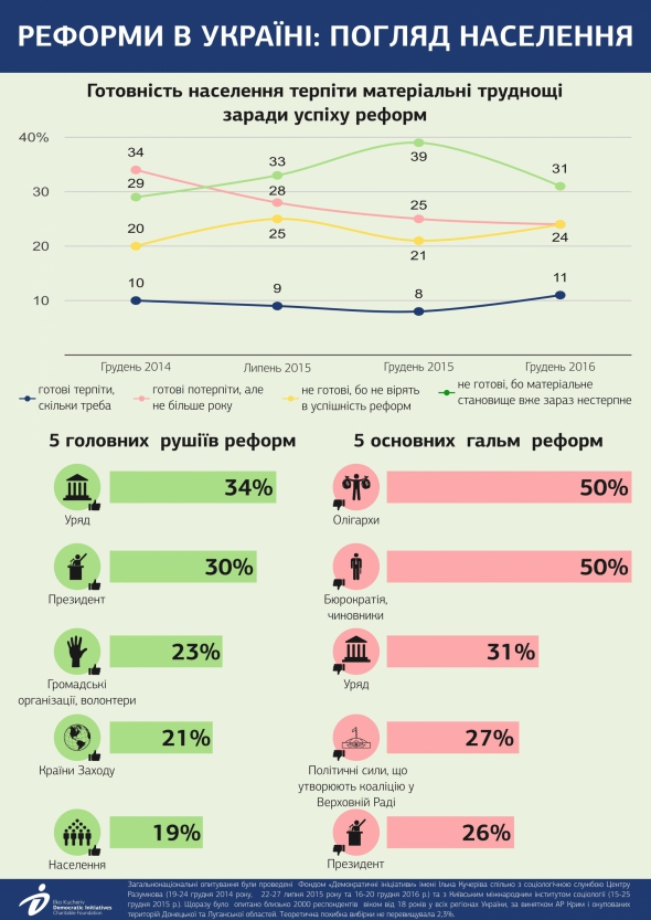 35% українців готові терпіти подальше зниження рівня свого життя заради кінцевого успіху реформ.